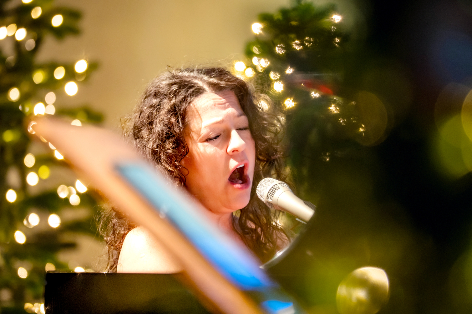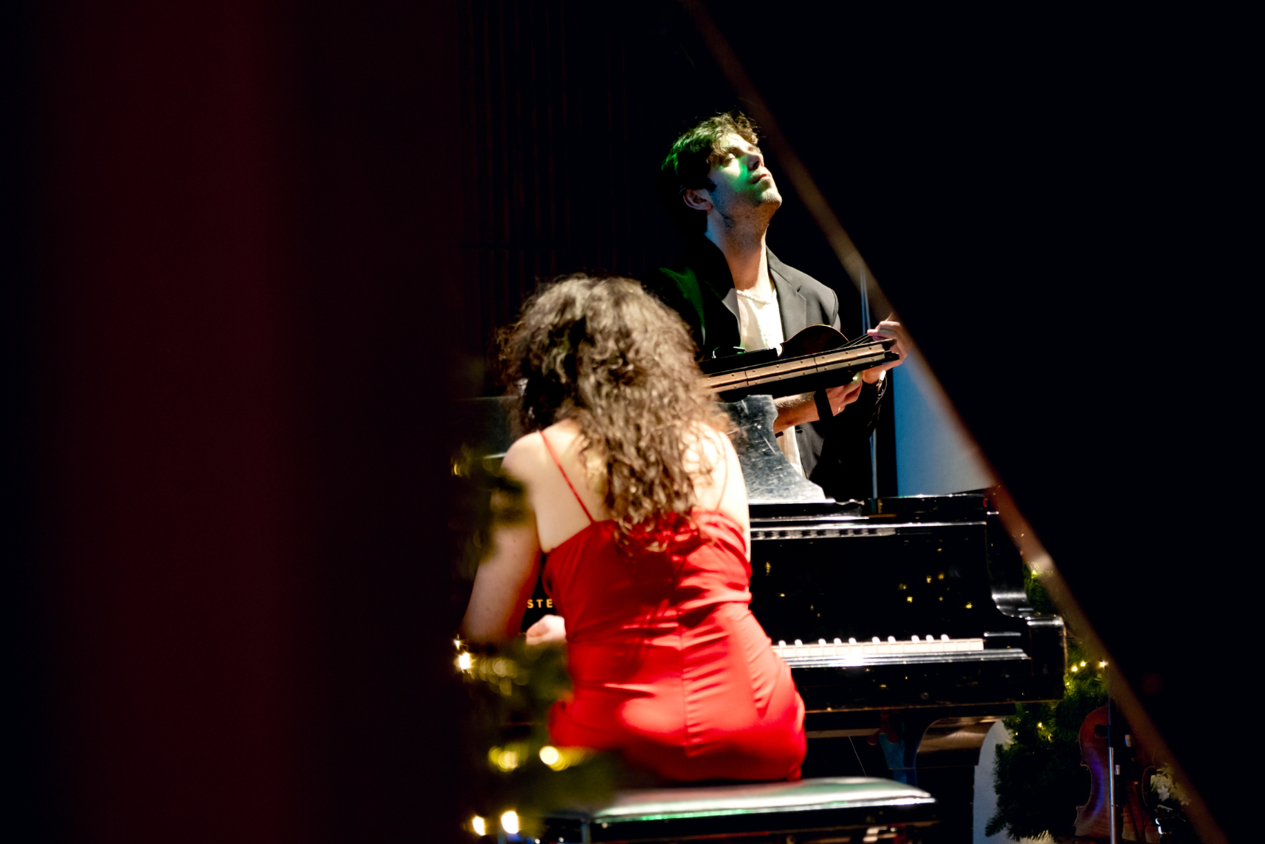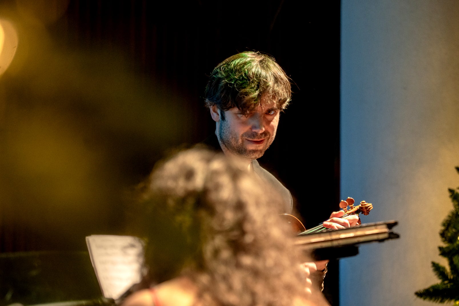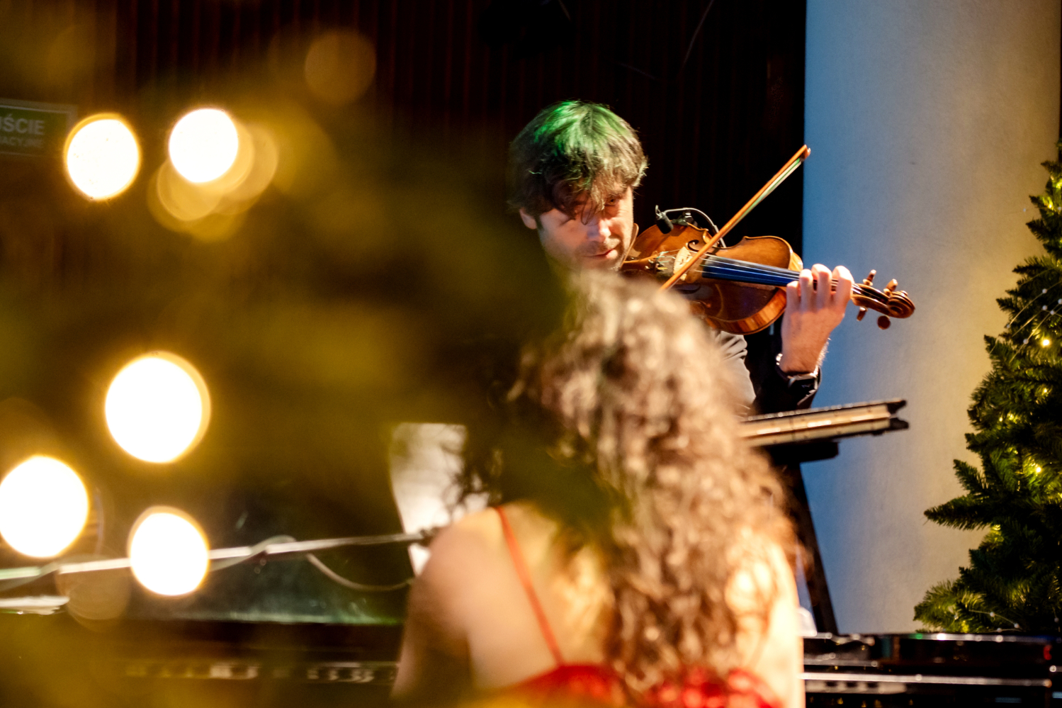 - Skrzypek wykonuje partię solową, widziany przez rozmyte światła choinki na pierwszym planie. Ujęcie tworzy intymną, świąteczną atmosferę koncertu.