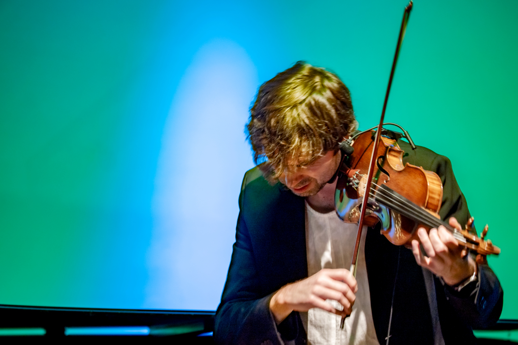 - Skrzypek gra solową partię, pochylony nad instrumentem. Intensywne, kolorowe światło sceniczne podkreśla skupienie muzyka i dynamikę wykonania.