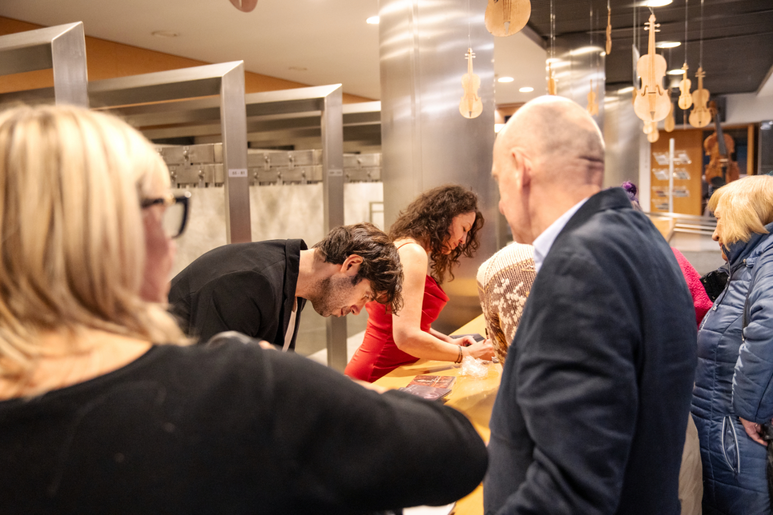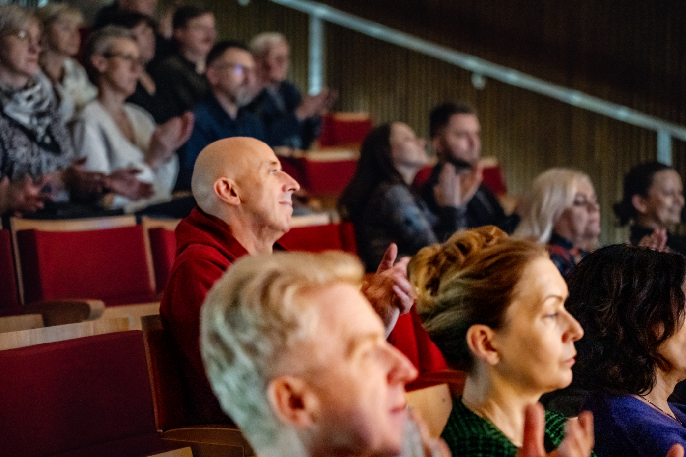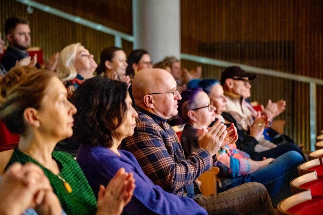 - Publiczność siedząca w rzędach sali koncertowej bije brawo. Widać skupione i zadowolone twarze słuchaczy, którzy reagują oklaskami.