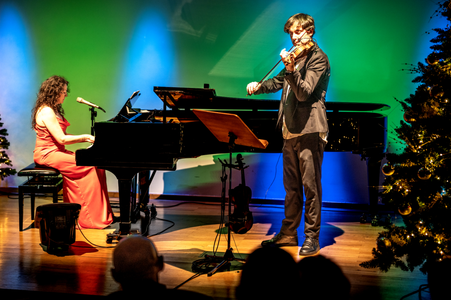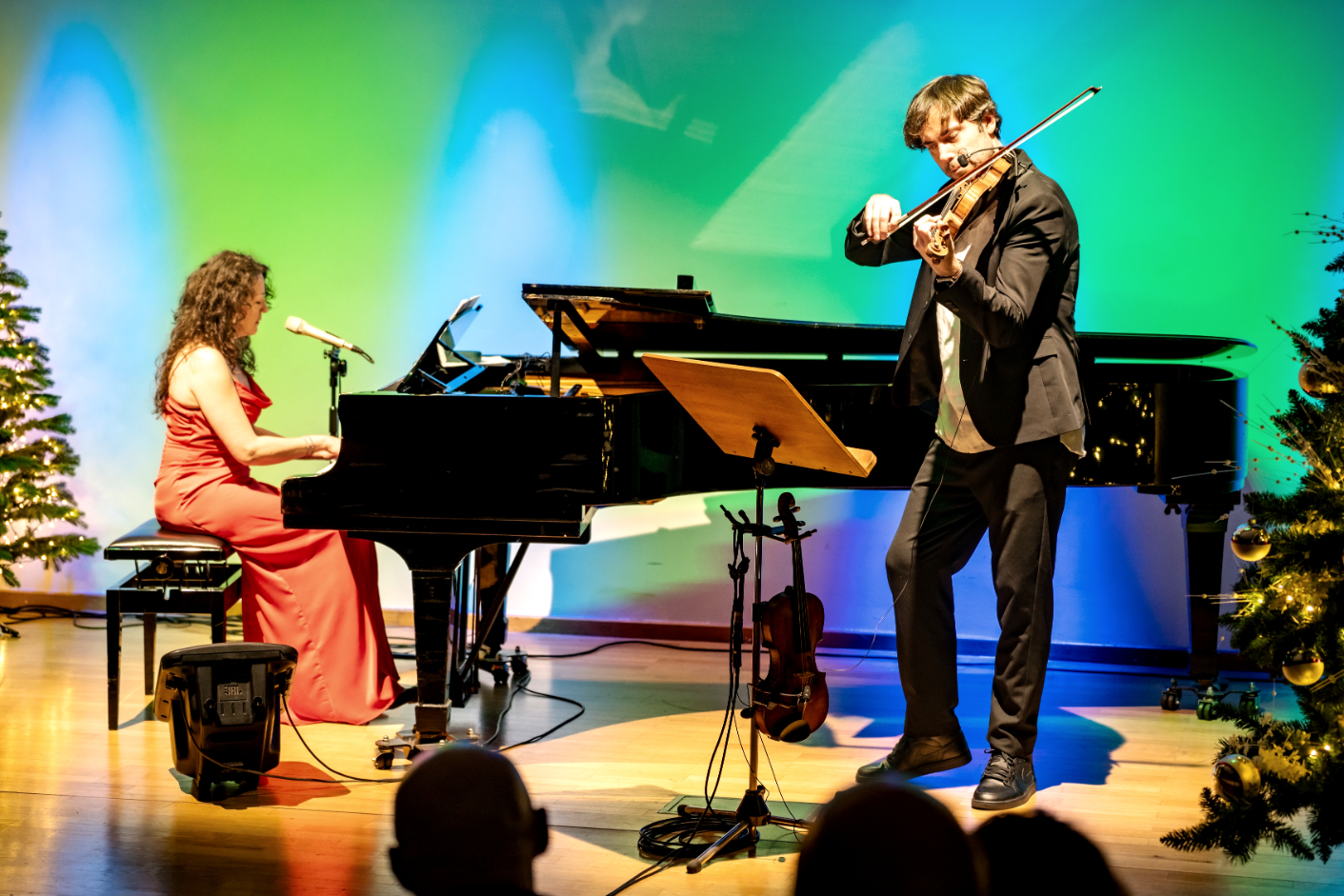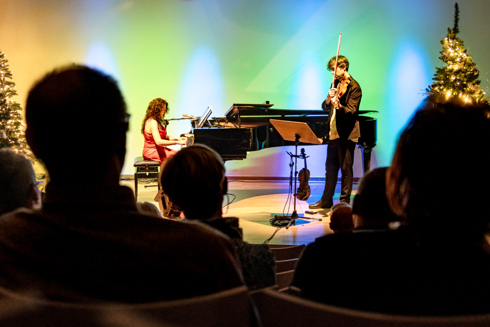 - Szeroki plan sali koncertowej: na scenie pianistka i skrzypek występują pomiędzy oświetlonymi choinkami. Publiczność wypełnia widownię, a kolorowe światła nadają wydarzeniu uroczysty charakter.