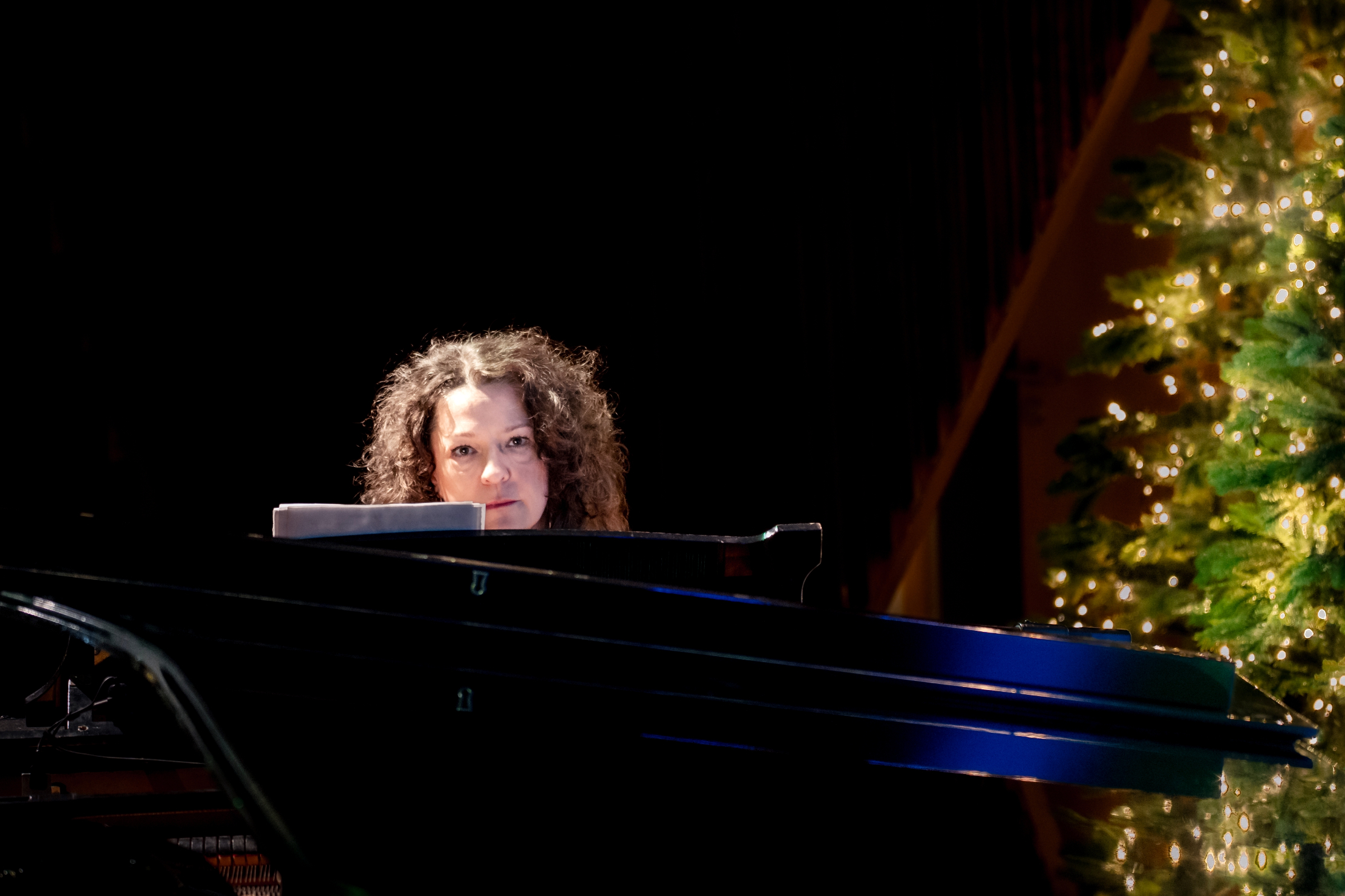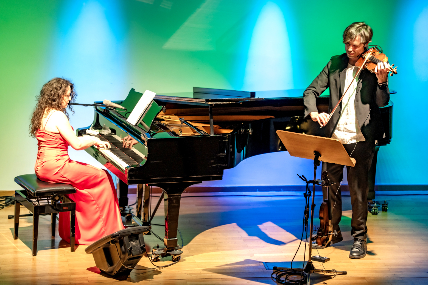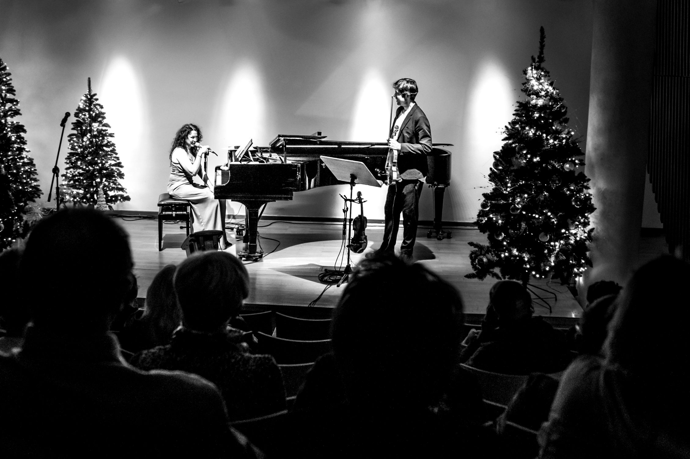 - Szeroki plan sali koncertowej: na scenie pianistka i skrzypek występują pomiędzy oświetlonymi choinkami. Publiczność wypełnia widownię, a kolorowe światła nadają wydarzeniu uroczysty charakter.