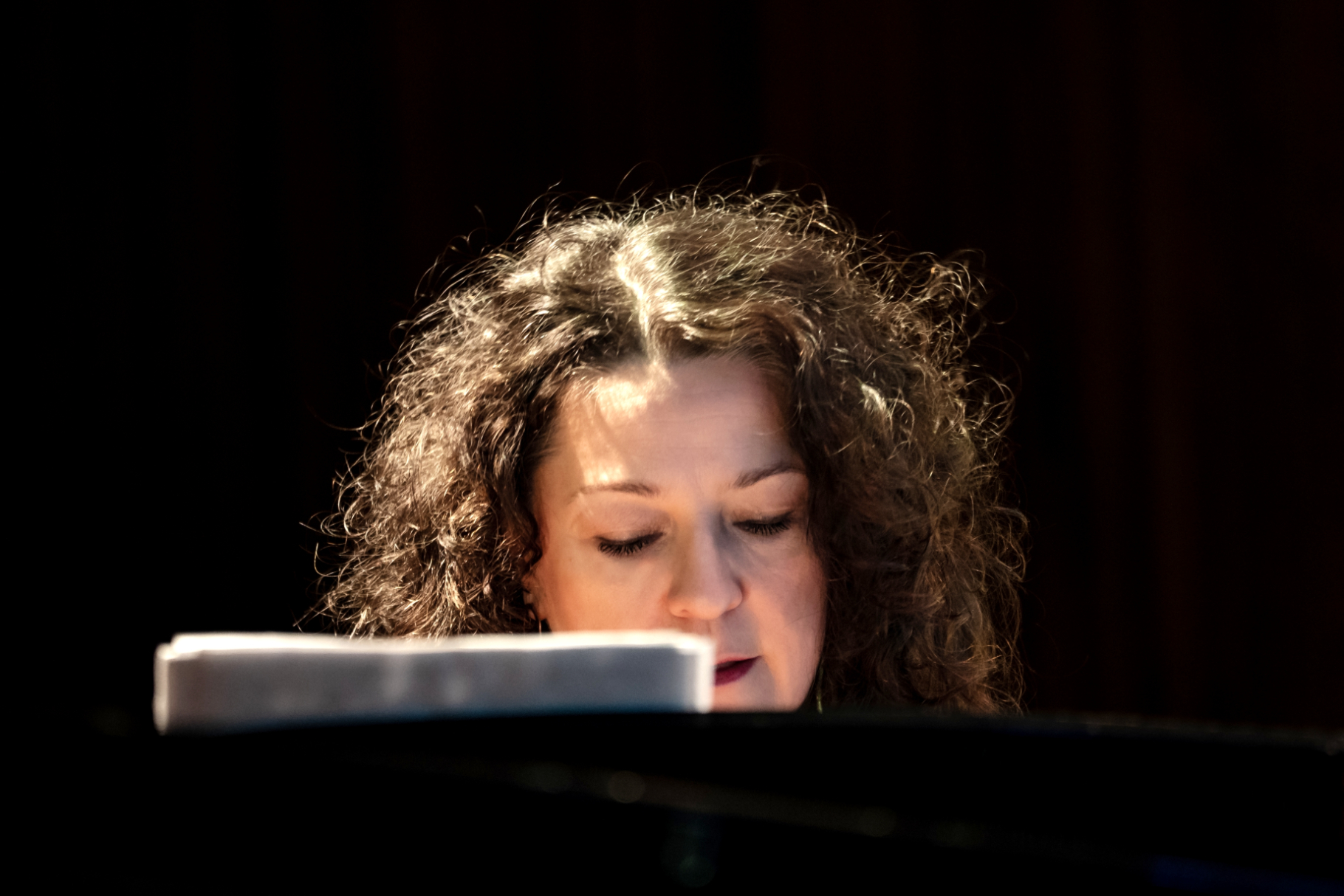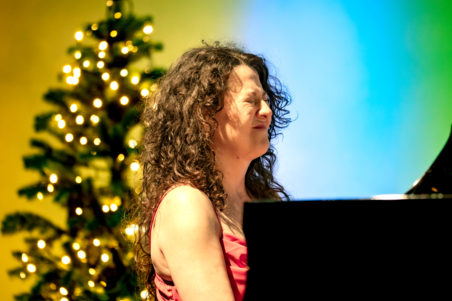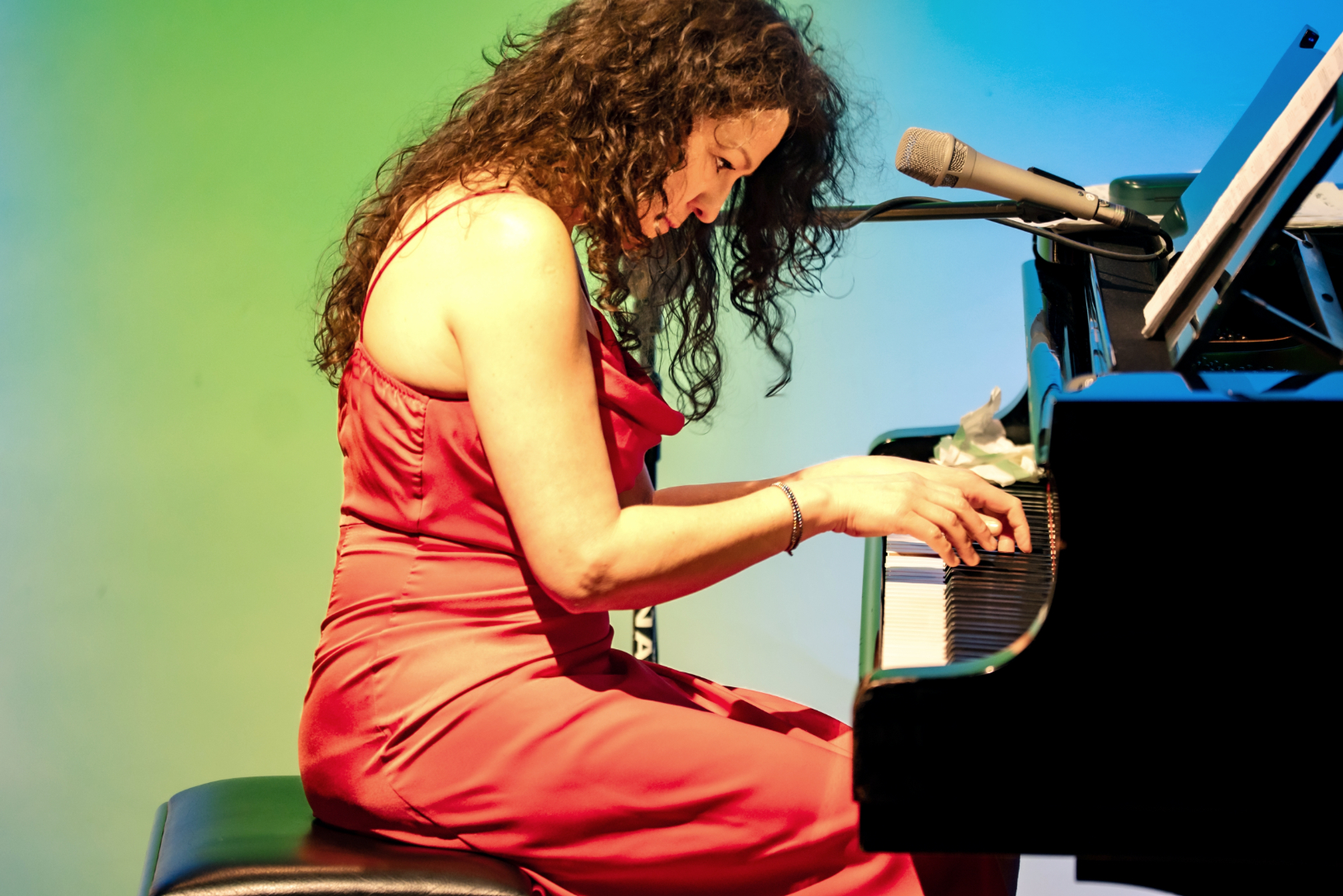 - Śpiewaczka w czerwonej sukni siedzi przy fortepianie i śpiewa do mikrofonu, spoglądając w stronę publiczności. W tle widoczny fragment instrumentu i miękkie, barwne oświetlenie sceny.